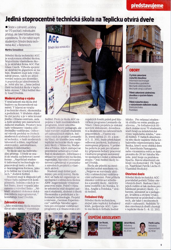 V měsíčníku Naše Ústí a Naše Teplice byl zvěřejněn obsáhlý článek o naší škole, která na okrese Teplice zůstala jako jediná stoprocentně technická škola. Nejsme škola spádová ale svá, kde se všichni známe, máme k sobě blíž.
